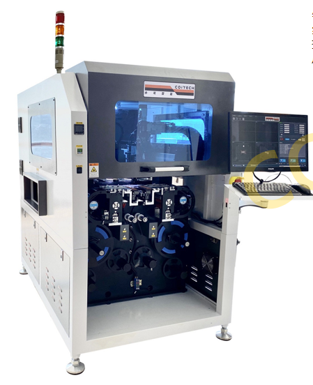主要用于對3C、柔性線路板(FPC)裝配制程中的輔材(PSA\TSA膠、標簽、PI、鋼片、泡棉、音膜等精密配件) 進行全自動在線式貼合,采用軌道傳送式結(jié)構,直線電機驅(qū)動X、Y軸和CCD相機掃描MARK點座標,利用送料器的剝離結(jié)構將待貼元件剝離,吸嘴貼附經(jīng)下CCD糾正后貼合在FPC指定位置上。